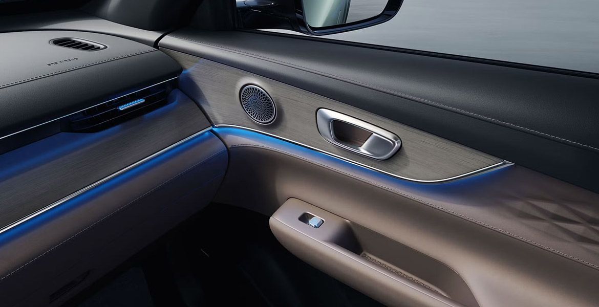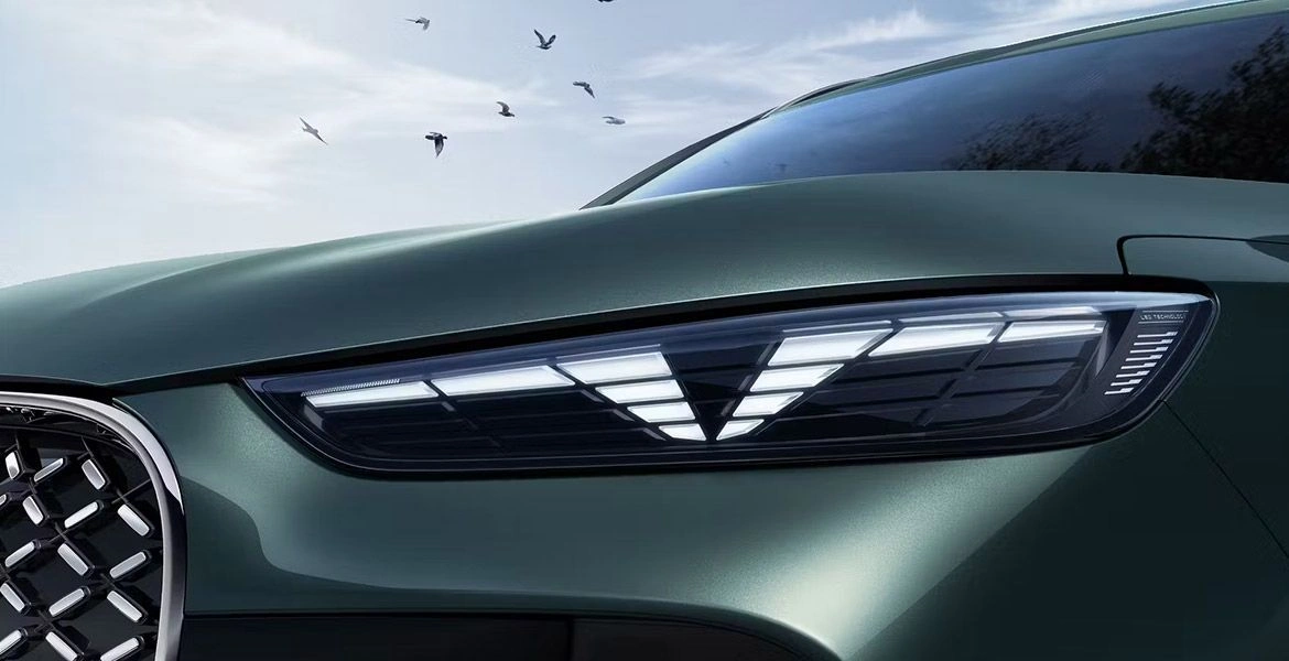 Крупная решетка радиатора с эффектным трехмерным узором и хромированной окантовкой формирует выразительный фронтальный вид. Глянцевые черные секции бампера объединяют ее с блоками полностью светодиодных фар, визуально расширяя автомобиль и подчеркивая его уверенную и стабильную позицию на дороге.