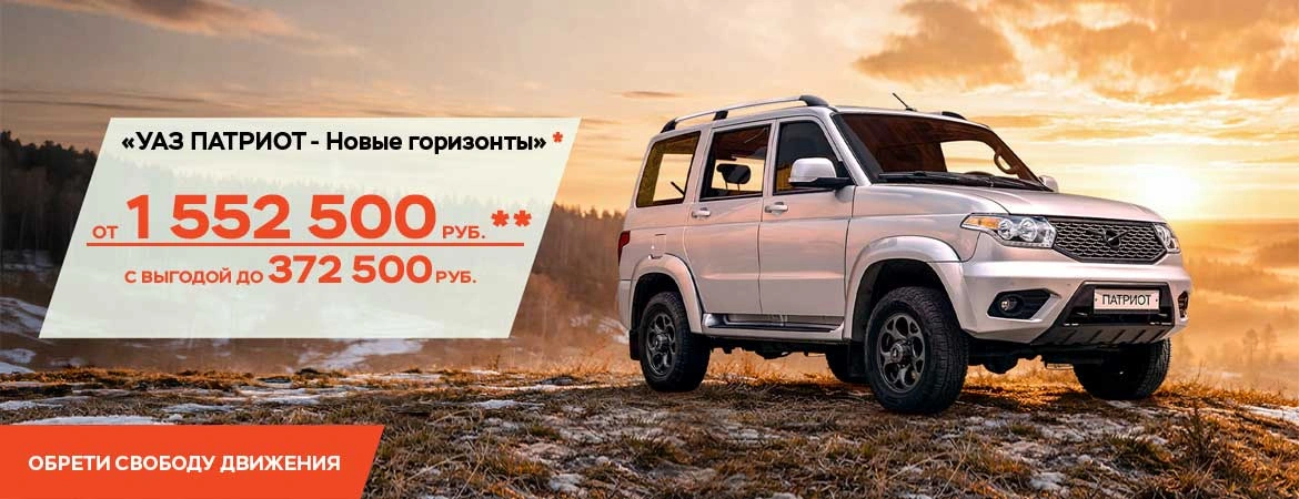 Успейте воспользоваться акцией «УАЗ ПАТРИОТ - Новые горизонты*» и получить скидку до 380 000р*. на покупку УАЗ Патриот с МКПП!