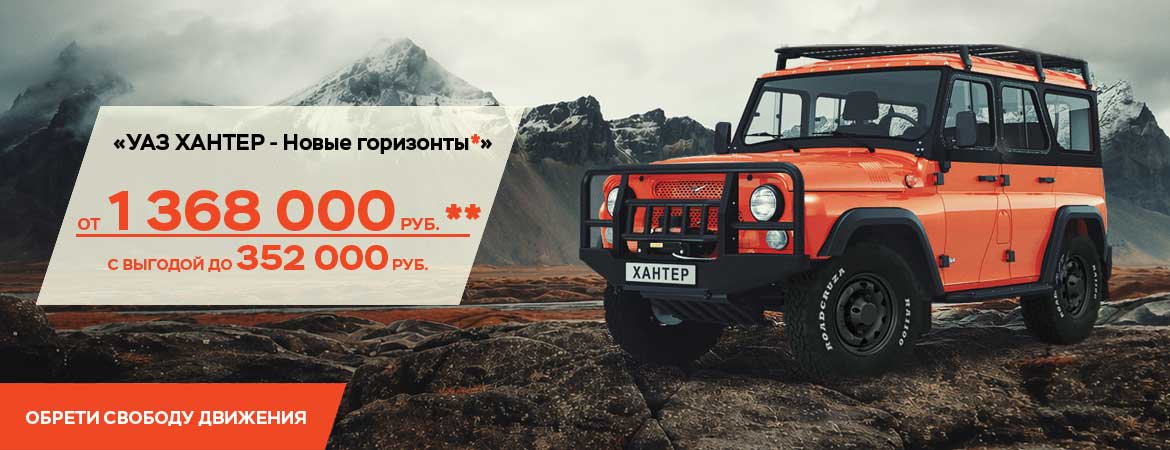 Успейте воспользоваться акцией «УАЗ ХАНТЕР - Новые горизонты*» и получить скидку до 352 000р*. на покупку УАЗ ХАНТЕР!