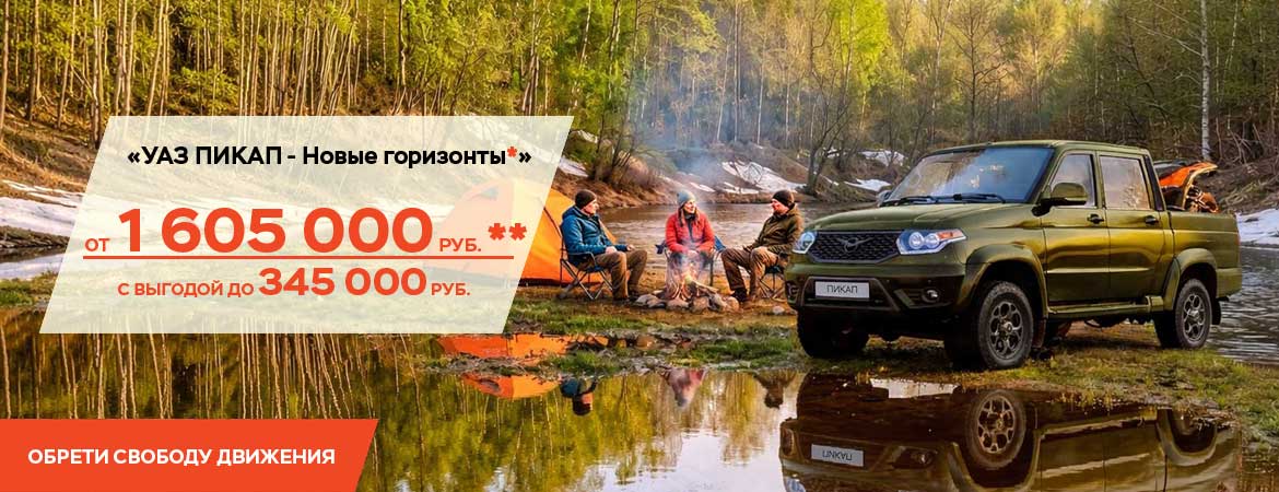 Скидка до 345 000₽ предоставляется от рекомендованной розничной цены. Сумма скидки рассчитана на автмобиль УАЗ ПИКАП в комплектации «Классик» на условиях: