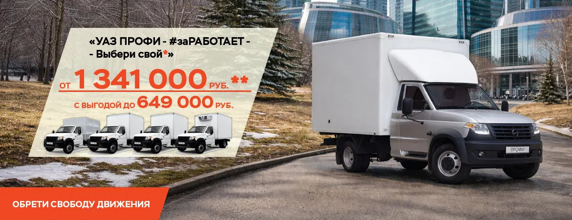 Успейте воспользоваться акцией «УАЗ ПРОФИ - Новые горизонты*» и получить скидку до 649 000р*. на покупку УАЗ ПРОФИ!
