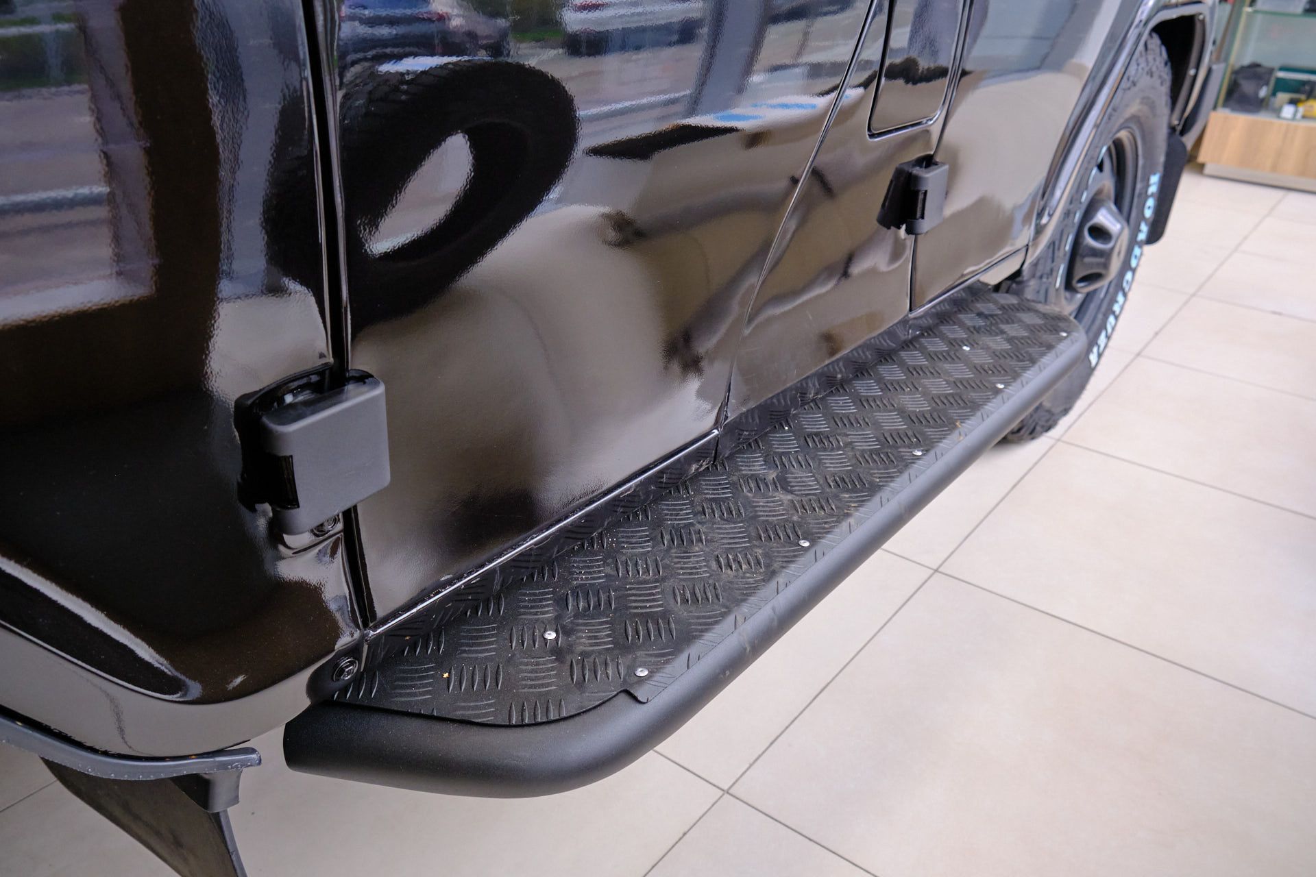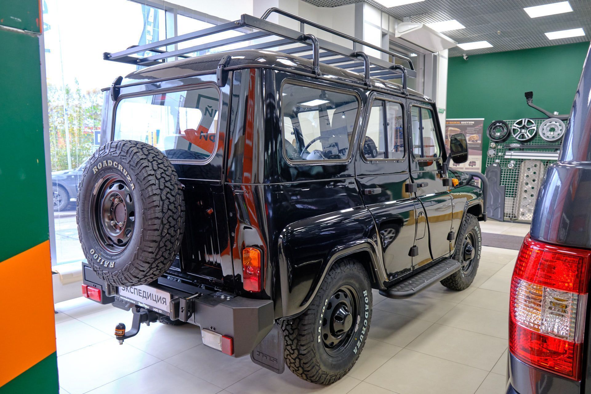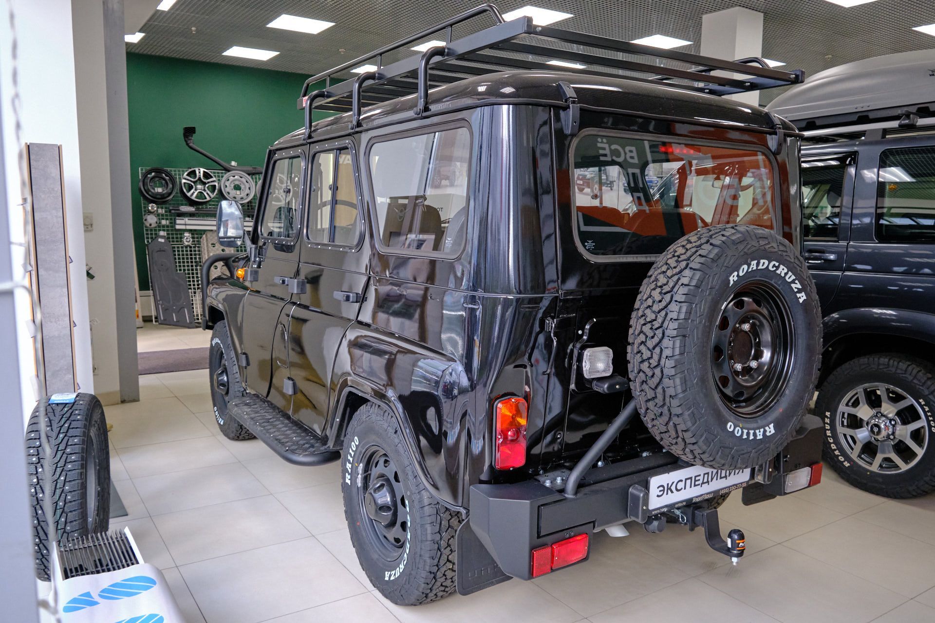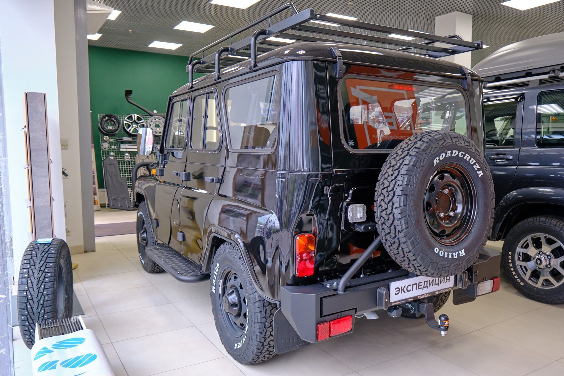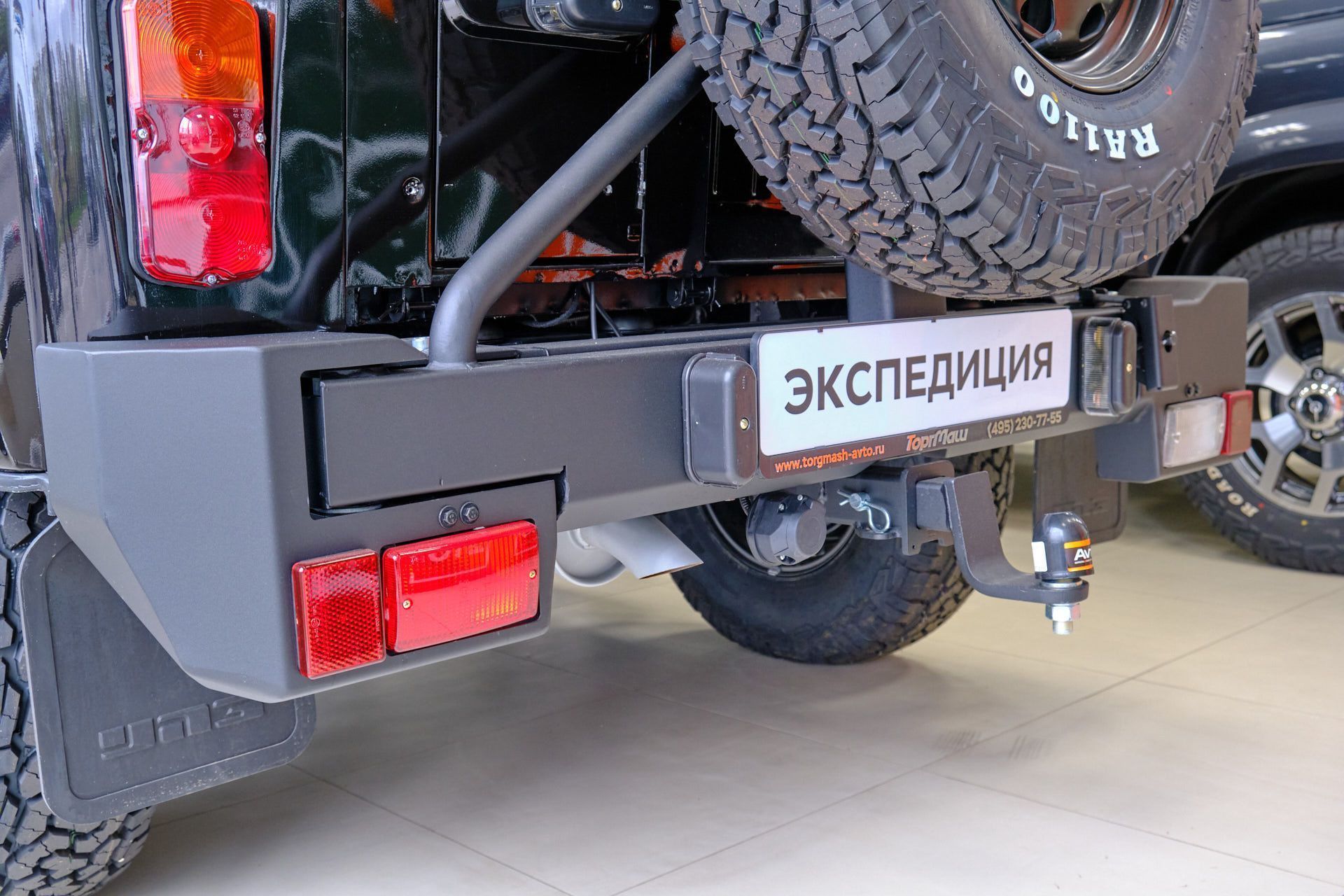 Брутальный внешний вид этого красавца подчеркивают мощные шины и задний силовой бампер с калиткой и фаркопом.