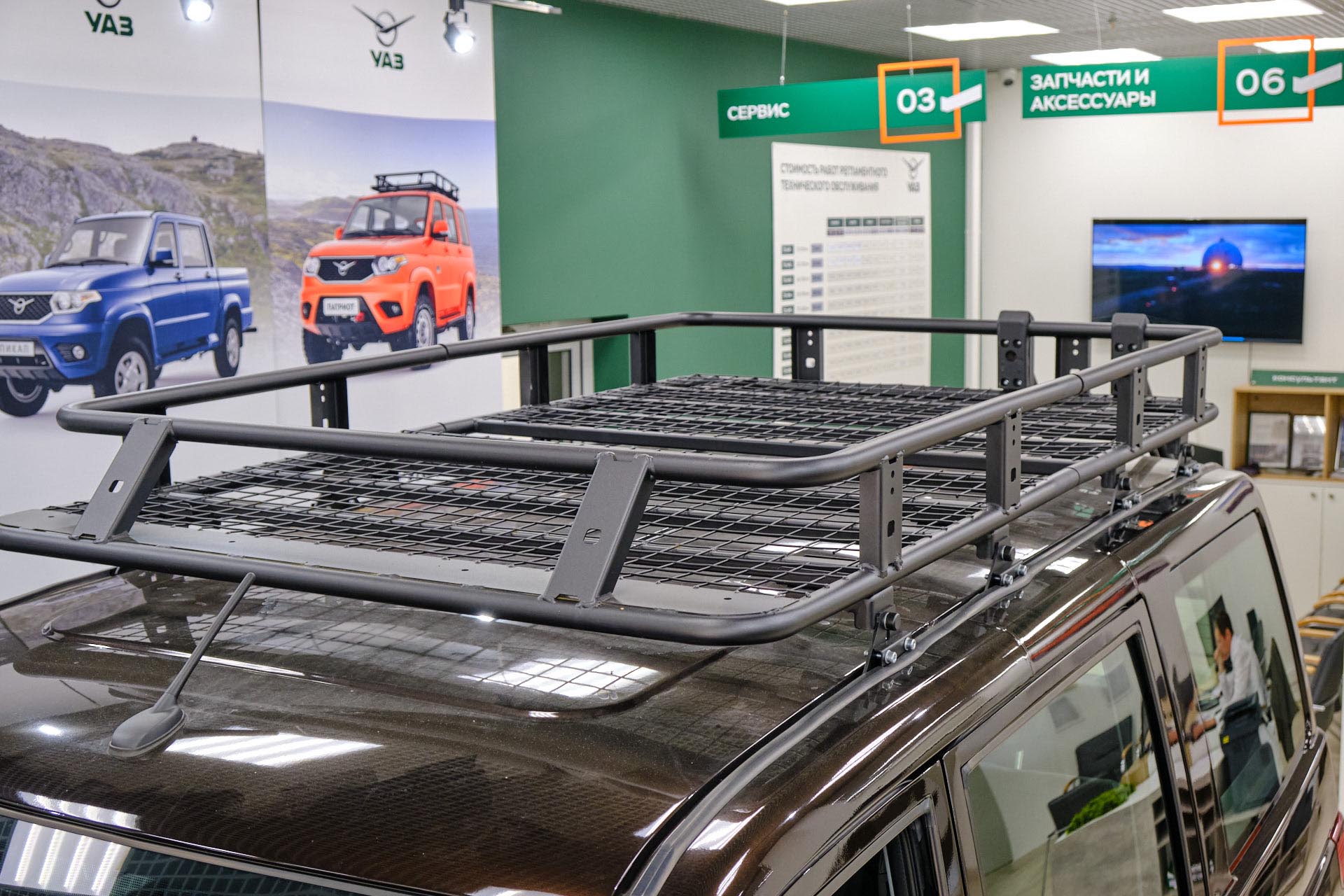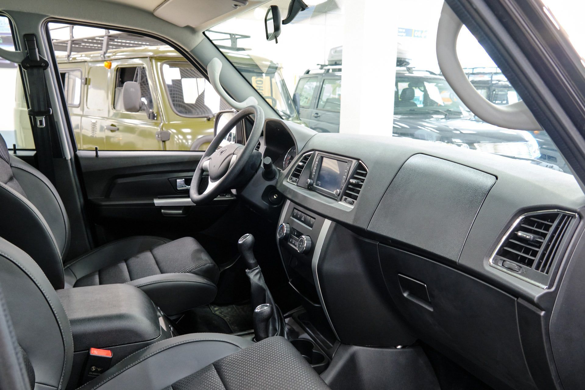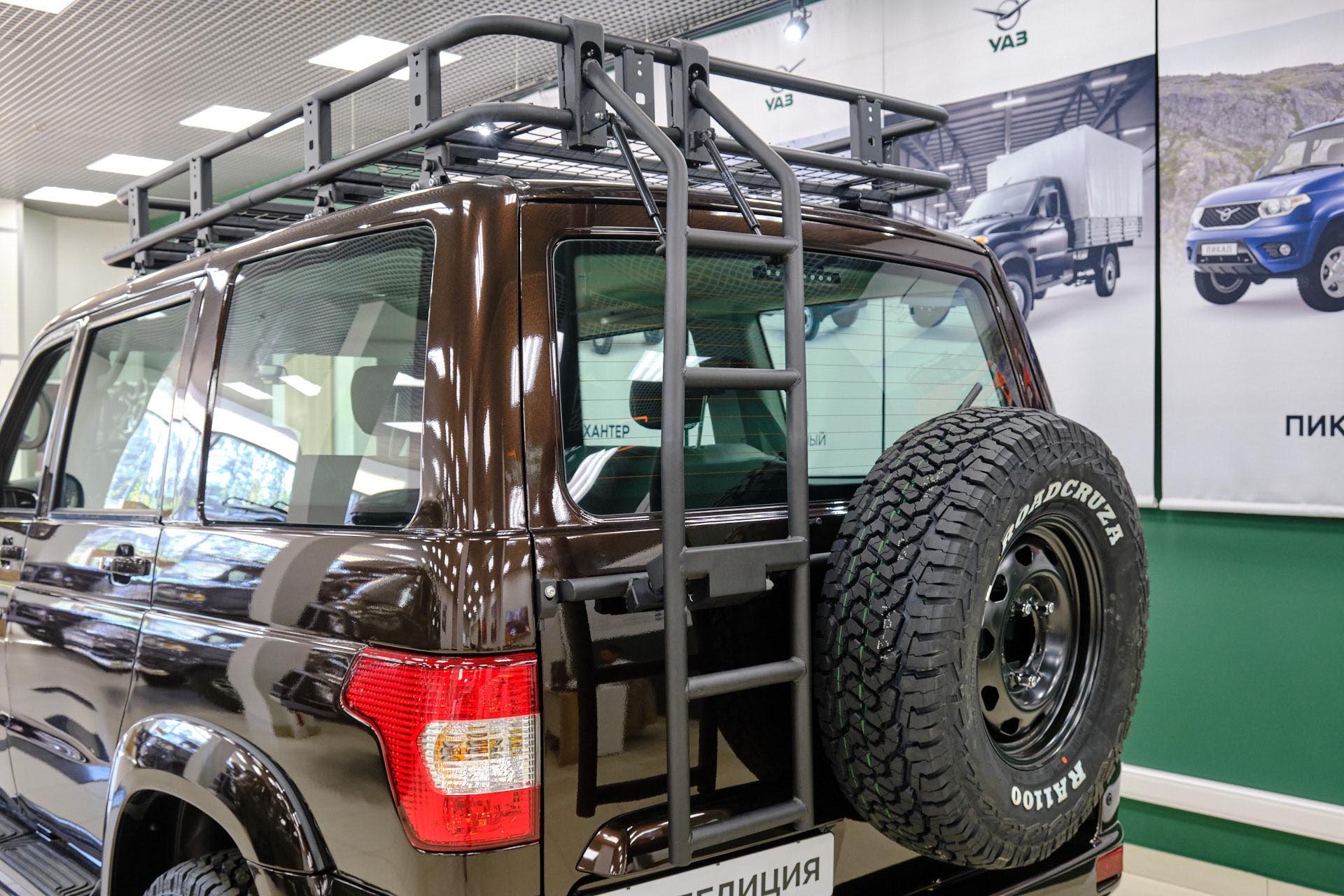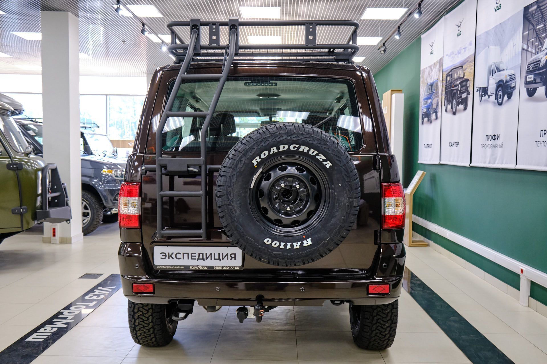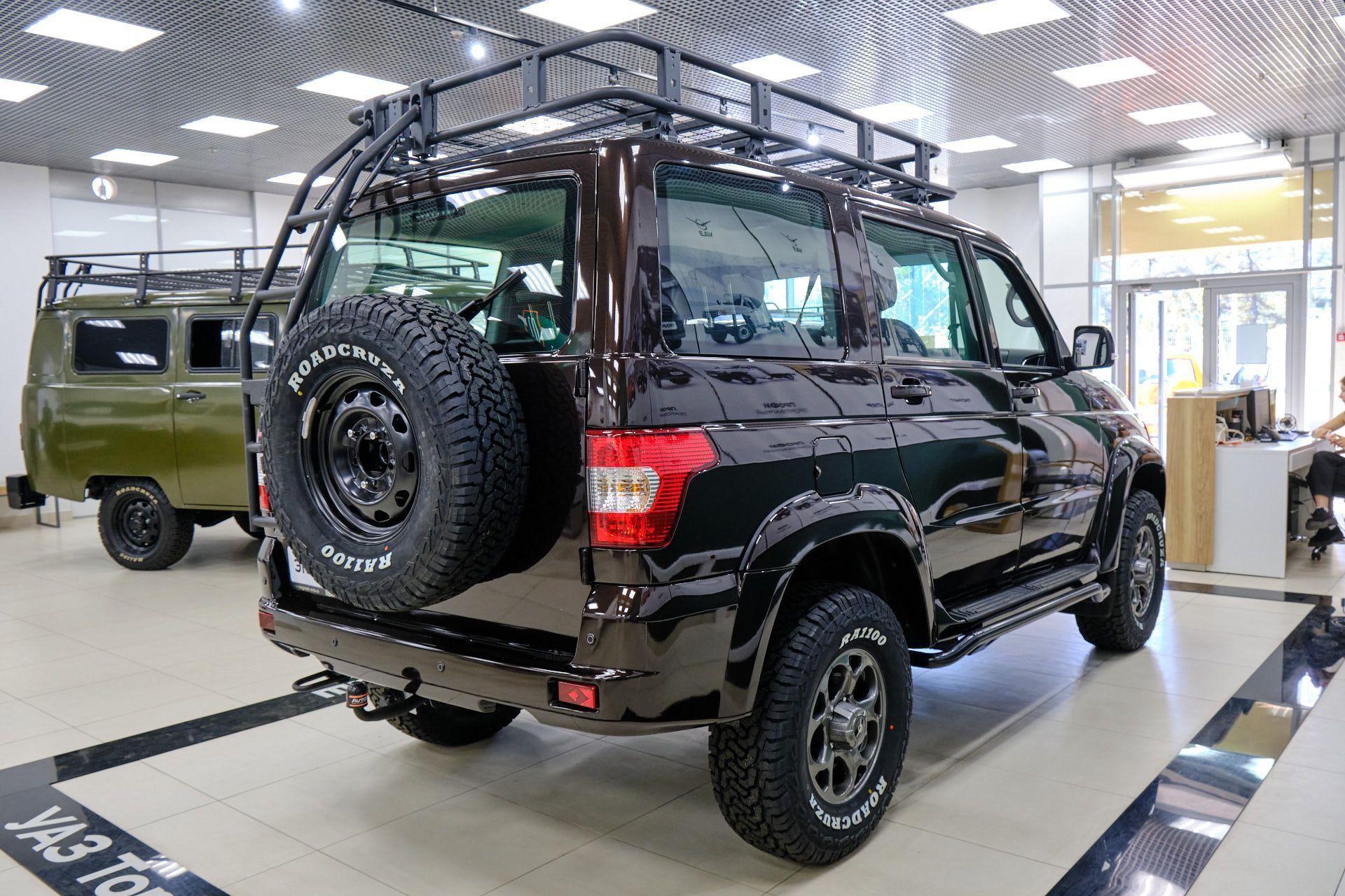 Модель отличается черной глянцевой решеткой радиатора в цвете Shine black, логотипом УАЗ аналогичного исполнения и новыми колесными дисками.